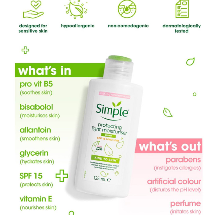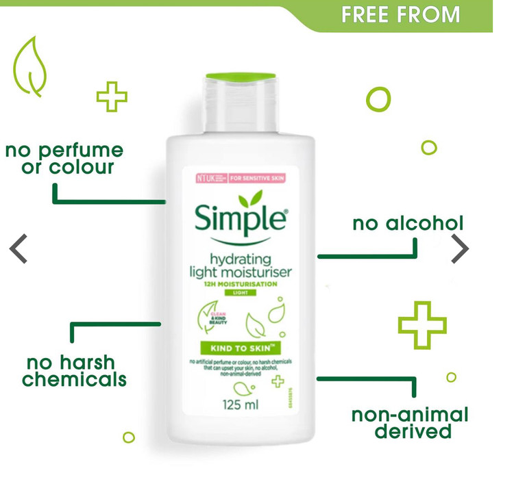 کرم آبرسان و مرطوب کننده سیمپل Simple یک محصول با توان مرطوب کنندگی قوی، ماندگاری بالا و جذب سریع است که میتواند خشکی پوست را برطرف کند و به شادابی آن کمک کند. این کرم حاوی ترکیبات مغذی است که پوست را تقویت میکنند و با فراهم کردن آبرسانی و حفظ رطوبت تا ۱۲ ساعت، از ایجاد چین و چروک و خشکی پوست جلوگیری میکند. این محصول بدون چربی است و منافذ پوست را مسدود نمیکند و به جوش ایجاد شده توسط آن نمیشود. همه افراد با هر نوع پوست میتوانند از این کرم استفاده کنند زیرا فاقد مواد تحریکپذیر و حساسیتزا برای پوست مانند الکل و مواد عطری است. در تولید این کرم از ترکیبات حیوانی استفاده نشده و این محصول وگان است. برند سیمپل حامی حقوق حیوانات بوده و محصولات آن بدون آزمایش بر روی حیوانات تولید میشوند.