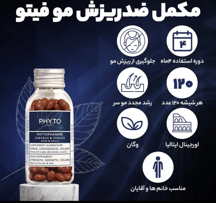 قرص فیتو (PHYTO) یک مکمل غذایی است که از ترکیبات گیاهی مختلف تهیه میشود. واژه “فیتو” از کلمه یونانی “φυτόν” “(Phyton)” گرفته شده است که به معنای “گیاه” است. این واژه معمولاً برای توصیف ترکیبات گیاهی استفاده می شود. ترکیبات گیاهی شامل موادی مانند آنتی اکسیدان ها، فیتواستروژن ها و پلی فنول ها هستند که می توانند بر سلامت انسان تأثیر بگذارند. مطالعات نشان داده اند که ترکیبات گیاهی می توانند به بهبود سلامت قلب، کاهش خطر ابتلا به سرطان، تقویت سیستم ایمنی بدن و بهبود عملکرد مغز کمک کنند. فیتو اولین مکمل ویتامینی که در سال ۱۹۶۹ برای تقویت رشد موی سالم، تقویت ناخنها و روشن کردن پوست به لطف ترکیبات فعال طبیعی آن ایجاد شد. مکمل فیتو دارای مواد طبیعی است که هر دوز روزانه از این قرص متشکل از اسیدهای چرب ضروری و یک ترکیب آنتی اکسیدانی است که باعث تولید کراتین، رشد موهای سالم، ناخنها و مژههای بلندتر میشود.