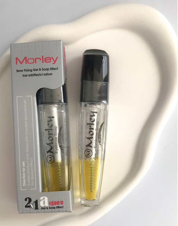 میکس صابون و ژل ابرو دو فاز آرگان دار مورلی MORLEY همانندیک ریمل ابروی بی رنگ به ابروهای شماشکل می دهد. برس حرفهای این ریمل تک تک تارهایمژه را شانه کرده و باعث نظم وهماهنگی آنها می گردد. ماده ژلی این محصول پس ازقرار گرفتن برروی موهای ابروفرم آن را به صورت ثابت نگه می دارد.